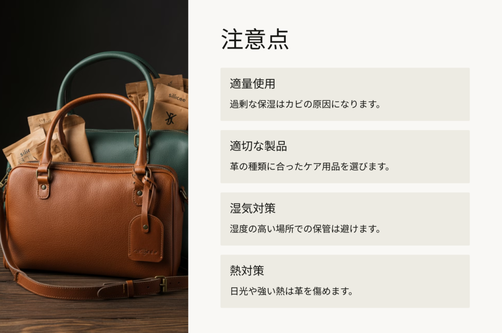- 水分の多い環境に注意: 革製品は湿気に弱いため、湿度の高い場所での保管や使用は避けましょう。湿気がこもるとカビが発生する可能性があります。