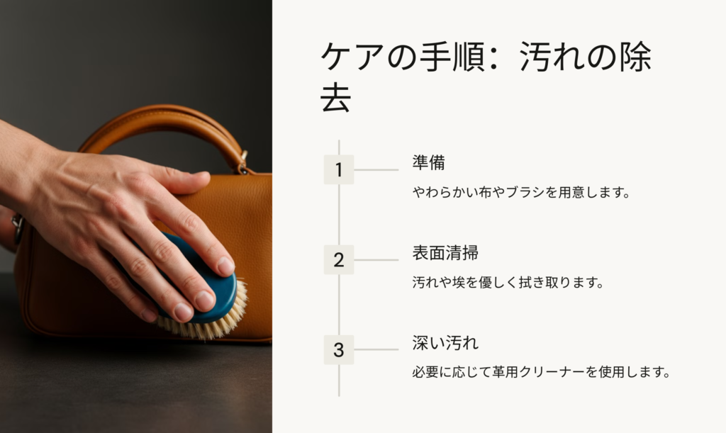最初に、革製品の表面の汚れや埃をやわらかい布やブラシで優しく拭き取ります。強くこすらないようにしましょう。革用のクリーナーを使うと、深い汚れも安全に落とせます。