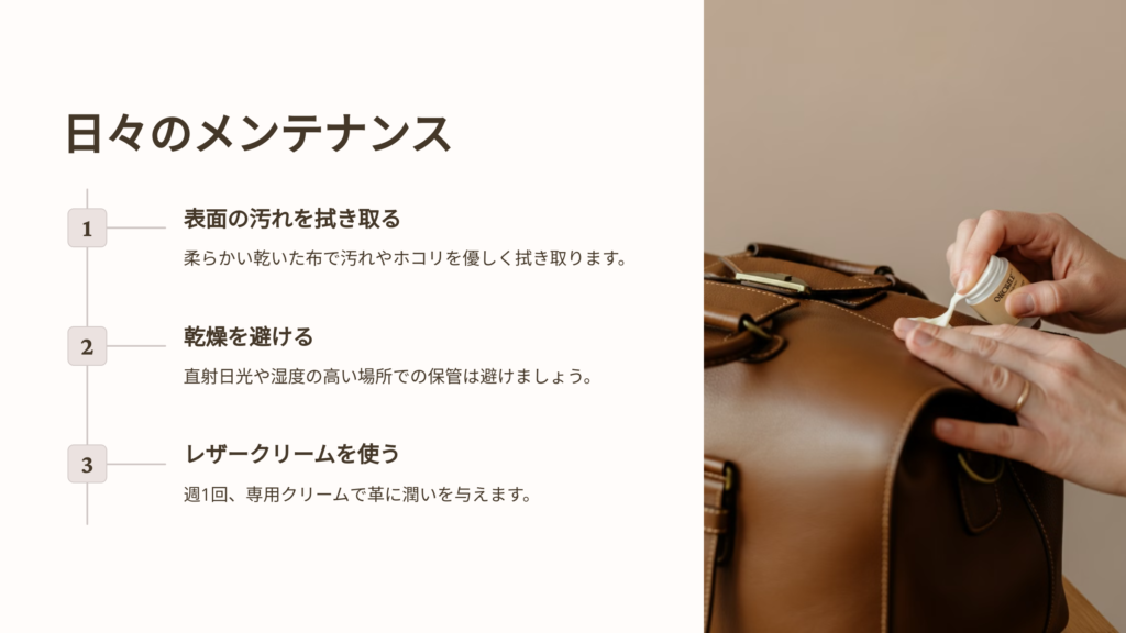 革製品は、日常的なケアが必要です。以下のステップを守ることで、革の劣化を防ぎ、長持ちさせることができます。