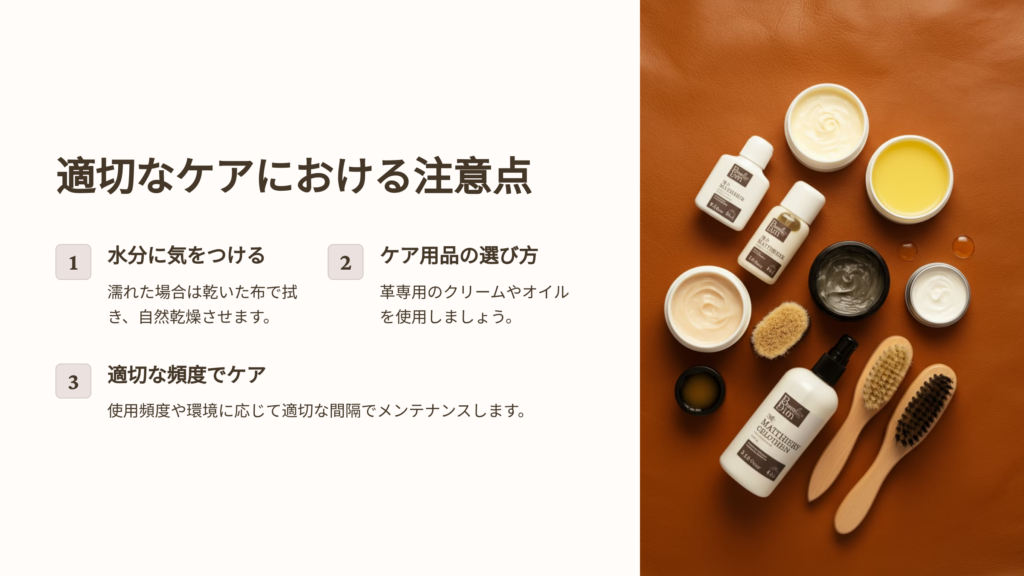 革製品をケアする際には、いくつかの注意点があります。これらを守ることで、革の質を損なうことなく、長く使用できます。