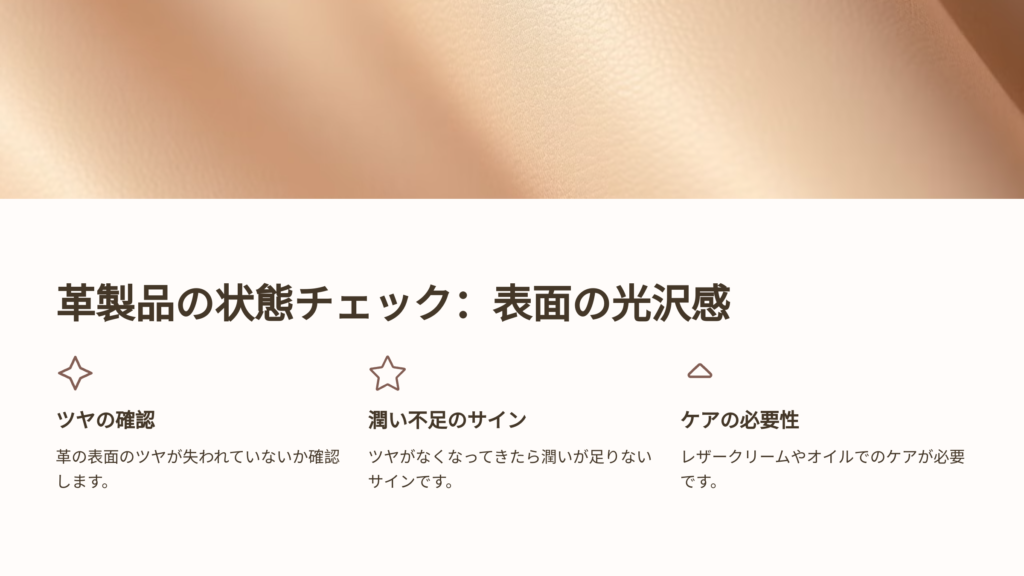 革製品の縫製部分や接着部分が緩んでいないか、ほつれが出ていないかをチェックします。ほつれや破れは、早めに修理すれば大きなダメージを防ぐことができるため、定期的に確認することが大切です。 - 表面の光沢感