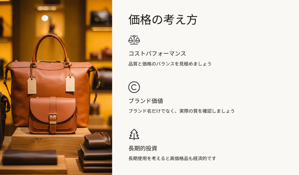 革製品の価格は、品質やデザインに応じて大きく異なりますが、購入時にいくつかの点を考慮することが重要です。