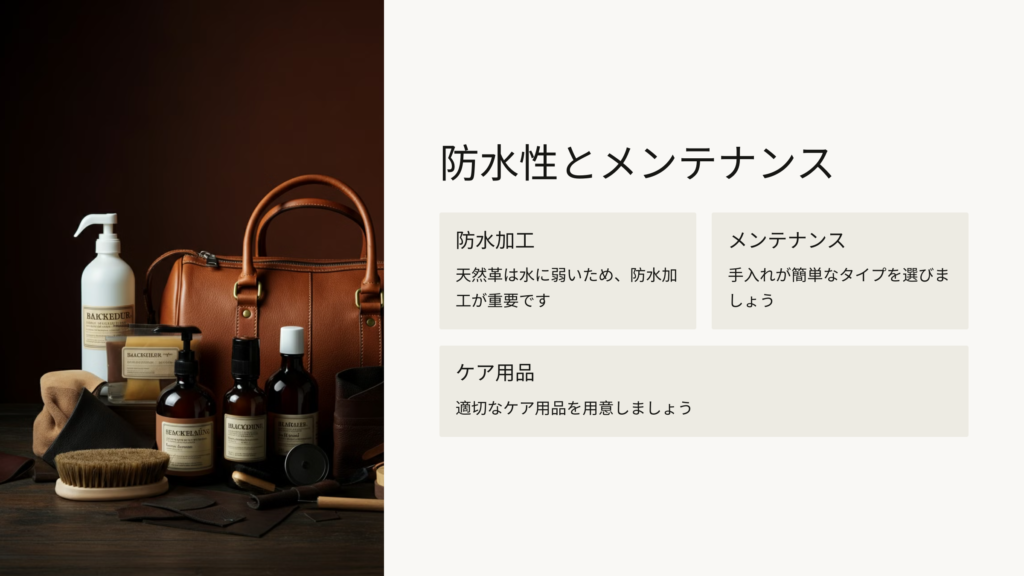 • 防水性・メンテナンス: 天然革は基本的に水に弱いので、防水加工が施されている製品や、購入後に適切な防水ケアをする必要があります。また、メンテナンスの手間も考慮し、手入れが簡単なタイプの革かどうかも確認しておきましょう。