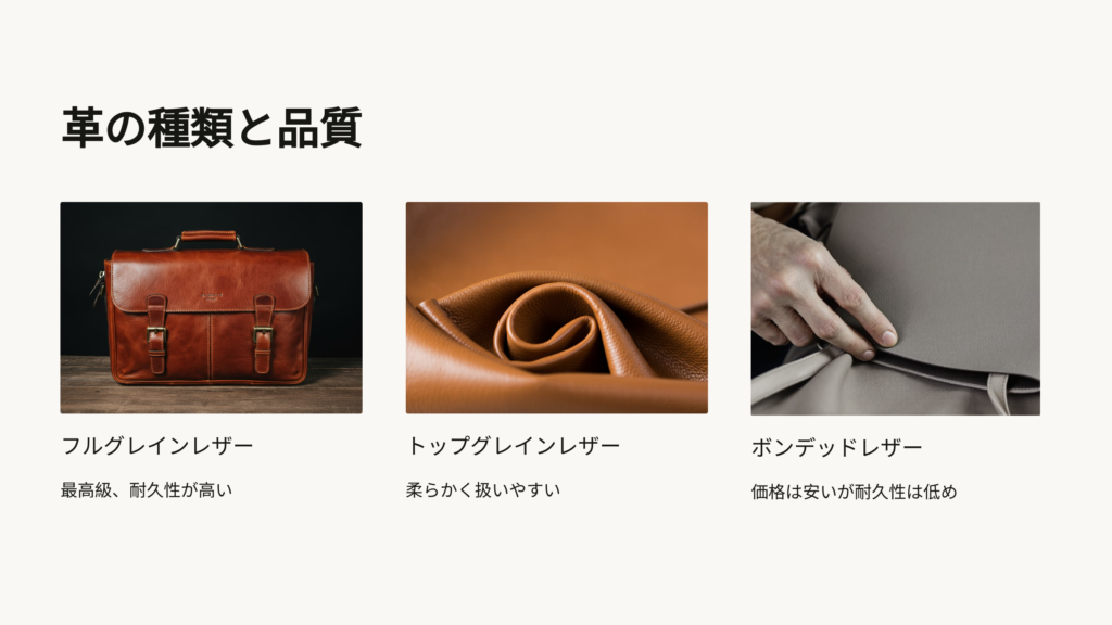 革製品の品質や耐久性は、購入時に最も重要なポイントです。これを見極めるための基準は次の通りです。